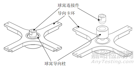 加載球頭與薄壁殼體構(gòu)件內(nèi)壁面形狀和尺寸完全一致,隨形工件粘附一層軟質(zhì)材料,通過(guò)加載螺桿對(duì)加載球頭施加軸向擰緊力矩,進(jìn)而加載球頭將力載荷傳遞給構(gòu)件。該裝置采用加載球頭可替換設(shè)計(jì),使用同一加載裝置,只需更換加載球頭,能夠?qū)崿F(xiàn)不同尺寸和形狀構(gòu)件的軸向載荷施加。如圖4所示,加載球頭內(nèi)部掏空,可降低裝置質(zhì)量;采用加筋設(shè)計(jì),可保證加載球頭強(qiáng)度和剛度的使用需求。力傳感器緊連加載球頭,用于對(duì)加載載荷進(jìn)行監(jiān)測(cè)。球窩連接件、球窩導(dǎo)向柱和導(dǎo)向卡環(huán)組合設(shè)計(jì),如圖5所示,一方面可降低各部件同軸度偏差所產(chǎn)生的橫向載荷,另一方面可消除因加載球頭轉(zhuǎn)動(dòng)而產(chǎn)生的扭矩。靜力加載裝置尺寸較小、質(zhì)量較低,可通過(guò)振動(dòng)夾具底座與振動(dòng)臺(tái)臺(tái)面簡(jiǎn)易剛性連接。