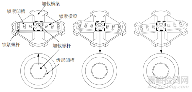 通過(guò)螺桿施加軸向載荷,在強(qiáng)振動(dòng)環(huán)境下預(yù)緊力容易大幅度衰減。為保證強(qiáng)振動(dòng)環(huán)境下力加載裝置長(zhǎng)時(shí)可用,通過(guò)如圖6所示鎖緊橫梁對(duì)加載螺桿固鎖,使振動(dòng)環(huán)境下加載螺桿預(yù)緊力不會(huì)在短時(shí)間內(nèi)明顯降低。齒形凹槽和鎖緊凹槽配合使用,可保證加載螺桿轉(zhuǎn)動(dòng)任意角度時(shí)都能夠被鎖緊,即保證通過(guò)加載螺桿施加于構(gòu)件的力載荷無(wú)極可調(diào)。通過(guò)6~8個(gè)鎖緊螺桿可更好的保證對(duì)加載螺桿的鎖緊效果。