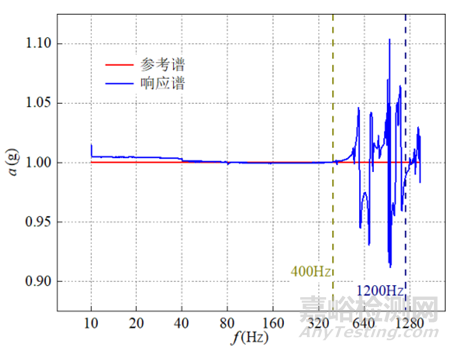 為對(duì)裝置的可行性進(jìn)行驗(yàn)證,以雙曲構(gòu)件為研究對(duì)象,設(shè)置力載荷初始值約為27.9kN,對(duì)裝置進(jìn)行了正弦掃頻振動(dòng)試驗(yàn),掃頻范圍(10~1500)Hz,加速度1g,掃頻速率1.5oct/min。采用3點(diǎn)平均控制方式,3個(gè)加速度傳感器均布在雙曲構(gòu)件法蘭。控制點(diǎn)響應(yīng)譜如圖7所示,相比于參考譜,在頻率400Hz以上出現(xiàn)明顯變化,表明裝置在較高頻率范圍內(nèi)產(chǎn)生明顯共振。