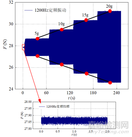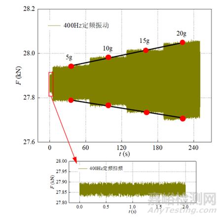 裝置共振必然對(duì)振動(dòng)環(huán)境下力載荷的長(zhǎng)時(shí)穩(wěn)定施加產(chǎn)生影響,為了對(duì)此有清晰認(rèn)識(shí),分別在400Hz和1200Hz下進(jìn)行定頻振動(dòng)試驗(yàn),試驗(yàn)量級(jí)從5g逐步提升到20g,力載荷初始值約為27.9kN。振動(dòng)環(huán)境下力載荷變化如圖8所示,從前兩秒的放大圖中可以看出,在振動(dòng)應(yīng)力未施加之前,采集到的力載荷背景噪聲均為±30N左右。隨著振動(dòng)量級(jí)增大,兩個(gè)頻率下的力載荷波動(dòng)幅度均隨之增大,且通過(guò)紅色圓點(diǎn)連線(xiàn)表明力載荷波動(dòng)的程度與振動(dòng)量級(jí)呈現(xiàn)出近似線(xiàn)性關(guān)系。試驗(yàn)過(guò)程中,力加載裝置固定于振動(dòng)臺(tái)臺(tái)面,伴隨薄壁殼體構(gòu)件共同振動(dòng),裝置和構(gòu)件慣性力的不同導(dǎo)致加載球頭與構(gòu)件之間往復(fù)擠壓,因而力載荷沿初始值對(duì)稱(chēng)上下波動(dòng),且上下波動(dòng)幅度幾乎相同。隨著振動(dòng)量級(jí)增大,薄壁殼體構(gòu)件與力加載裝置所受慣性力差距增大,與初始力載荷存在更明顯的疊加效應(yīng),因而力載荷波動(dòng)幅度隨振動(dòng)量級(jí)增大幾乎呈線(xiàn)性關(guān)系增長(zhǎng)。薄壁殼體構(gòu)件實(shí)際工作時(shí)承受不斷重復(fù)的高/低載荷條件,力加載裝置可有效賦予構(gòu)件真實(shí)的環(huán)境效應(yīng)。