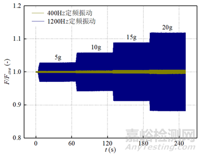 為了進(jìn)一步明確裝置共振對(duì)力載荷波動(dòng)的影響程度,對(duì)兩個(gè)頻率下采集到的力載荷進(jìn)行歸一化處理,即將每一時(shí)間對(duì)應(yīng)的力載荷與整個(gè)時(shí)域范圍內(nèi)力載荷平均值做比值,得到歸一化處理結(jié)果,如圖9所示。相比于非共振點(diǎn)(400Hz),共振點(diǎn)(1200Hz)的力載荷波動(dòng)幅度在任意振動(dòng)量級(jí)下都急劇增大,顯然共振頻率下的力載荷波動(dòng)不僅僅由慣性力的差距引起,更多源自于系統(tǒng)共振使力加載裝置各部件之間的碰撞造成。薄壁殼體構(gòu)件在實(shí)際使用時(shí),未出現(xiàn)如此劇烈的共振現(xiàn)象,因此當(dāng)振動(dòng)頻率較高時(shí),力加載裝置難以賦予構(gòu)件實(shí)際工作時(shí)真實(shí)的高/低載荷條件。該構(gòu)件常用工作環(huán)境下的振動(dòng)頻率不超過(guò)350Hz,而該裝置在400Hz以?xún)?nèi)未出現(xiàn)明顯共振現(xiàn)象,因此可有效用于模擬構(gòu)件在真實(shí)工作環(huán)境下的力振耦合條件,滿(mǎn)足薄壁殼體構(gòu)件在力和振動(dòng)耦合環(huán)境下的可靠性試驗(yàn)需求。