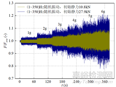 4)在相同振動(dòng)量級(jí)下,施加的初始靜力增大時(shí),力載荷波動(dòng)幅度隨之增大,可有效模擬構(gòu)件實(shí)際工作時(shí)的高/低載荷條件。
