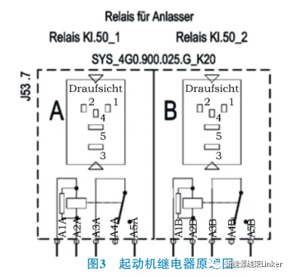 2)這些繼電器是發(fā)動機線束的下級散件,因此繼續(xù)檢查發(fā)動機線束圖紙,確認(rèn)燒蝕中心為起動機的繼電器,其原理如圖3所示。