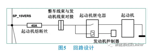 由此得知,此處繼電器燒蝕時的電流應(yīng)該不超過40 A,否則熔斷絲會熔斷從而斷開回路。根據(jù)燒蝕最嚴(yán)重的位置處于繼電器內(nèi)部,推測可能是繼電器內(nèi)部有持續(xù)或者間斷的小電流流通,導(dǎo)致繼電器引腳反復(fù)吸合從而過熱,進而引發(fā)整個繼電器的燒蝕。繼續(xù)檢查此處的回路設(shè)計,原理如圖5所示。