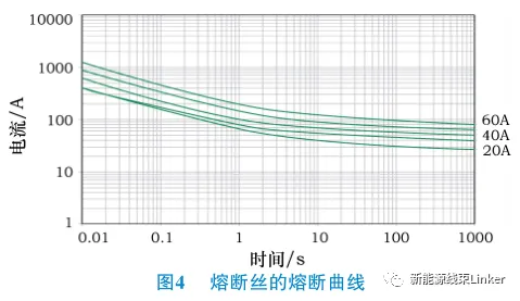 按照線束的設(shè)計規(guī)范,熔斷絲是用來保護導(dǎo)線的,此處的導(dǎo)線線徑為6 mm 2 ,沒有發(fā)生明顯的燒蝕現(xiàn)象,并且熔斷絲也沒有熔斷,證明其持續(xù)的電流并沒有達到熔斷絲的熔斷電流。對此處的熔斷絲和線徑匹配情況進行核查,根據(jù)企業(yè)內(nèi)部標(biāo)準(zhǔn),40 A的JCase熔斷絲在高溫情況下(105℃)所匹配的最小線徑為6 mm 2 ,初步檢查此處符合設(shè)計要求。檢查此處的繼電器選型,根據(jù)繼電器的零件圖紙得知此繼電器的負(fù)載電流為40 A,再對熔斷絲的熔斷曲線進行檢查,如圖4所示。由圖4可知,在電流為40 A的情況下,此熔斷絲可以長期工作而不發(fā)生熔斷,而如果電流為50 A時,則會在大約40 s時熔斷。