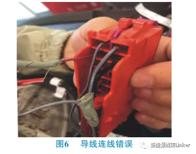 將整車主線束從碰撞車上拆下后進行拆解分析,并與線束圖紙進行對比核查,發(fā)現(xiàn)另外一處熔斷絲盒內(nèi)出現(xiàn)了導(dǎo)線連線錯誤,如圖6所示,其中的1號熔斷絲的進線端和2
