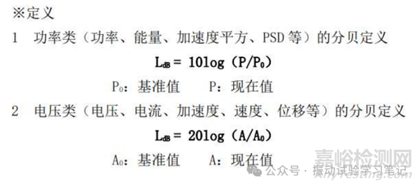 振動試驗中經(jīng)常會出現(xiàn)dB(分貝)的概念,概念定義請參考上面鏈接文章復(fù)習(xí)一下,需要注意的是它分兩種情況,一種是加速度、速度、位移、電壓、電流等使用的dB,另一種是能量、功率、PSD等使用的dB,兩者的區(qū)別是定義式前面的系數(shù)不同。一個是20,一個是10。