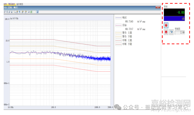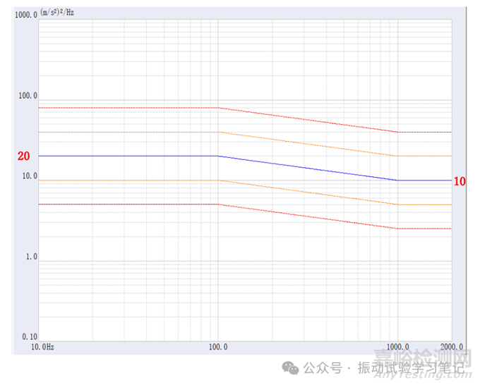 有些試驗標(biāo)準(zhǔn)給出警告和中斷dB值,很多試驗標(biāo)準(zhǔn)都是默認(rèn)正負(fù)3dB和正負(fù)6dB,為什么默認(rèn)這兩個值,作者從事這么多年一直沒有找到答案。但個人猜測可能和試驗材料的安全系數(shù)有關(guān),學(xué)過《機械設(shè)計》的讀者可能記得一般取安全系數(shù)1.3至1.4之間,也就是3dB左右,通過牛頓第二定律計算受到1.3倍的推力激勵,試驗體材料還是安全的,不會損壞,但需要我們注意。材料的破壞系數(shù)一般為2,即6dB,受到2倍的推力激勵,材料破損,試驗就沒有必要進(jìn)行,為了對稱,下限也就取-3dB和-6dB了。以上僅為一家之言,僅供參考。