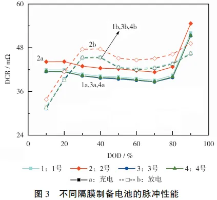 不同隔膜制備電池的脈沖性能見圖3。從圖3可知,隨著電池DOD的增加,充放電的DCR呈增大趨勢,其中,不同DOD下,1號、3號和4號電池的DCR差異不大,2號電池的DCR均高于前3者約5%,說明輥涂涂覆工藝,較高的涂膠量對電池的DCR影響較大。這可能與涂膠層的覆蓋率較高,影響了離子電導(dǎo)率性能有關(guān)。
