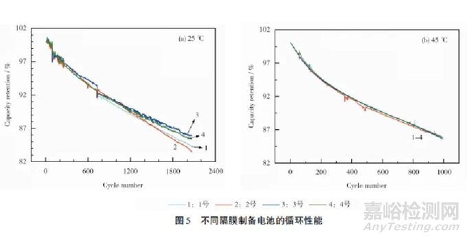 不同隔膜制備電池在不同溫度下的循環(huán)性能見圖5。從圖5可知:1~ 4號電池在25℃常溫循環(huán)時,前1000次的容量保持率無明顯的差異;在45℃高溫循環(huán)時,1000次的容量保持率差異較小。