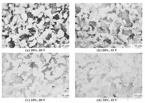 圖1 不同高氯酸體積分?jǐn)?shù)電解液和電解電壓下電解拋光后試樣的顯微組織