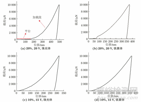 圖3 不同高氯酸體積分?jǐn)?shù)電解液和電解電壓下電解拋光后珠光體和鐵素體的載荷-位移曲線