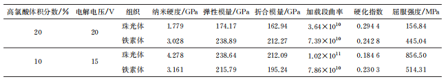 表2 不同高氯酸體積分?jǐn)?shù)電解液和電解電壓下電解拋光后珠光體和鐵素體的納米壓痕測(cè)試結(jié)果