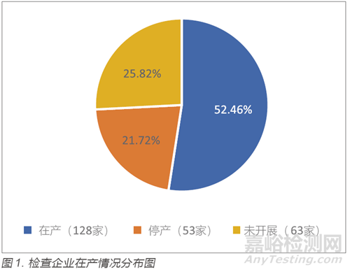 第一,在產(chǎn)企業(yè)占比較少,從“拿證”到產(chǎn)業(yè)化轉(zhuǎn)化率不高。244 家企業(yè)中,檢查時無人員,未開展檢查的63 家,停產(chǎn)53 家,在產(chǎn)128 家,分布情況如圖1 所示。開展檢查的企業(yè)中,平均每家發(fā)現(xiàn)缺陷3.25 項。在產(chǎn)128 家企業(yè)中,所有受托生產(chǎn)企業(yè)均按要求開展生產(chǎn)放行,2 家注冊人未按要求開展上市放行。