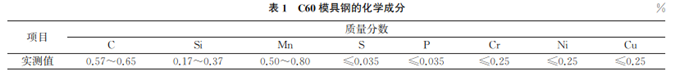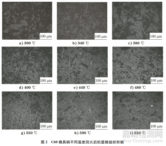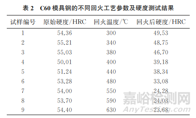 試驗材料選用厚度為3mm的C60模具鋼,其化學(xué)成分如表1所示,該產(chǎn)品已經(jīng)過淬火處理。合適的回火工藝能調(diào)整模具鋼原始組織的不均勻性和硬度,以滿足實際生產(chǎn)需求。經(jīng)過多次的試驗研究,制定了合適的C60模具鋼回火試驗方案。將試樣回火溫度分別設(shè)置為300,340,380,400,440,480,550,590,630℃,保溫2h后出爐自然空冷。