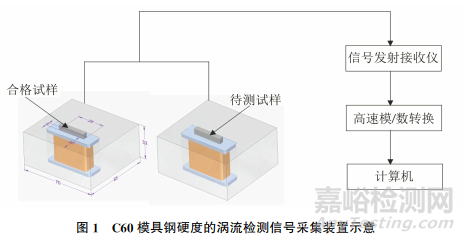 C60模具鋼硬度的渦流檢測信號采集裝置如圖1所示。由圖1可知:檢測裝置由穿過式渦流探頭、渦流信號發(fā)射接收裝置、高速模/數(shù)采集卡、計算機等組成。當(dāng)待測C60模具鋼勻速通過穿入式渦流探頭,同時在激勵線圈中接通4000Hz的正弦交流電時,金屬材料中會產(chǎn)生交變磁場,引起材料的渦流信號發(fā)生變化,通過高速模/數(shù)轉(zhuǎn)換采集渦流信號,最后顯示在計算機上。