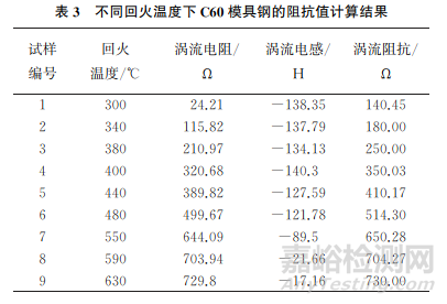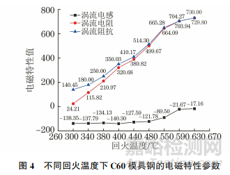 (1)對淬火后的C60模具鋼進行回火處理,在保溫時間相同的條件下,隨著回火溫度的升高,C60模具鋼顯微組織中回火屈氏體的含量逐漸減少,回火馬氏體含量增加,鐵素體體積增大,原子的熱運動減弱,使原子自旋耦合現(xiàn)象增強,從而提高了渦流電磁參數(shù)。當(dāng)回火溫度為630℃時,渦流阻抗達到最大。