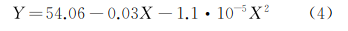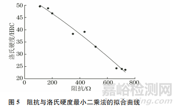 橫軸為經(jīng)計算得到的阻抗,縱軸為超聲硬度計測量得到的洛氏硬度,其最小二乘法的擬合曲線如圖5所示,一元二次擬合方程如式(4)所示。
