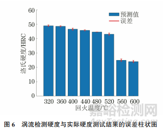 由圖6可知:渦流檢測硬度與實際硬度測試結(jié)果相差不大,滿足±1HRC的精度要求。利用渦流檢測法可以對C60模具鋼進行硬度測試,即擬合公式(4)可實現(xiàn)對不同回火溫度下C60模具鋼的渦流表征。
