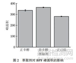 由圖2可知,以異辛醇作萃取劑時(shí),BPF的峰面積較高,因此試驗(yàn)選擇異辛醇作萃取劑。
