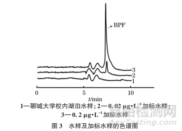 向上述聊城大學(xué)校內(nèi)湖泊水樣中分別加入0.02,0.2μg·L-1BPF,按照試驗(yàn)方法測(cè)定,所得回收率為92.3%~113%。3種樣品的色譜圖見圖 3。