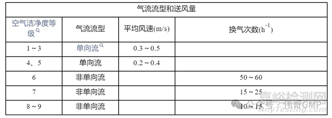 注:1)換氣次數(shù)適用于層高小于4.0m的潔凈室。2) 應(yīng)根據(jù)室內(nèi)人員、工藝設(shè)備的布置以及物料傳輸?shù)惹闆r采用上、下限值。