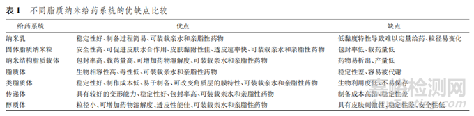 經(jīng)皮給藥因具有避免首過效應(yīng)、減少胃腸道不良反應(yīng)、安全性高、便于給藥等諸多優(yōu)勢,已成為臨床中常用 的給藥途徑[8-9]。脂質(zhì)納米載體具有較小的粒徑,有利于藥物透過角質(zhì)層到達皮膚深層,可持續(xù)緩慢釋放藥物,穩(wěn)定性佳,是經(jīng)皮給藥的首選載體[10]。目 前,基 于 材 料 特 性研究人員已成功設(shè)計多種脂質(zhì)納米給藥系統(tǒng)應(yīng)用于經(jīng)皮給藥,如納米乳、固體脂質(zhì)納米粒、脂質(zhì)體、醇質(zhì)體、傳遞體 等[11]。脂質(zhì)納米給藥系統(tǒng)在應(yīng) 用中的優(yōu)缺點見表 1。