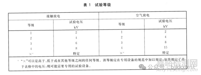 標(biāo)準(zhǔn)將試驗(yàn)等級(jí)分成四級(jí):對(duì)接觸放電分別設(shè)為2kV,4kV,6kV和8kV;對(duì)氣隙放電分別設(shè)為2kV,4kV,8kV和15kV。