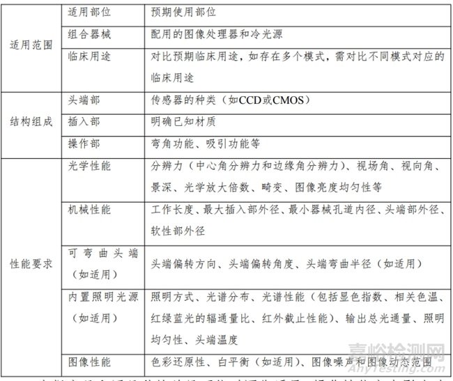 1)光學(xué)性能包括視場角、中心角分辨力、邊緣角分辨力、景深、畸變、色彩還原性、照明鏡體光效、亮度響應(yīng)特性、信噪比、空間頻率響應(yīng)、靜態(tài)圖像寬容度等。2)機械性能包括尺寸、外觀、操控性能、吸引性能、彎曲性能、密封性能、與附件配合的性能等。