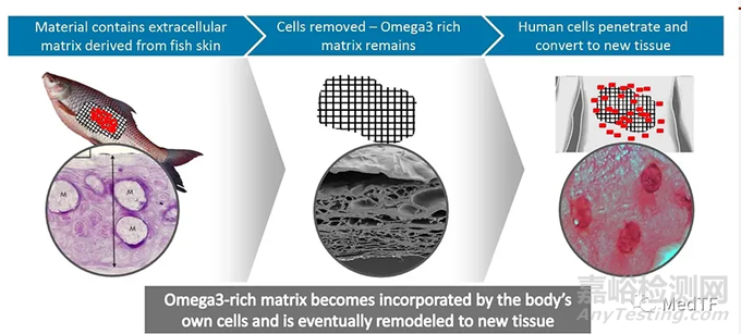 Kerecis Shield采用Kerecis獨(dú)有一種魚皮處理技術(shù),用北大西洋鱈魚魚皮為原材料,并通過溫和處理工藝(包括脫細(xì)胞工藝等),使魚皮保留完整的表皮和真皮層。同時(shí)魚皮還含有脂質(zhì)和蛋白質(zhì),可以協(xié)同作用,幫助身體再生受損組織。