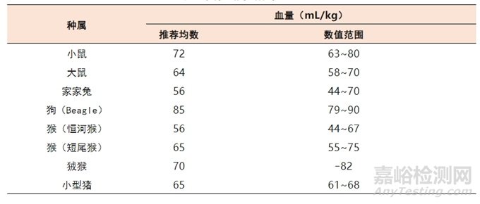 血液總量取決于物種、性別、年齡、健康及營養(yǎng)狀況。對于同一種物種,較大動物單位體重的總血量比較小的動物要少,老齡和肥胖動物單位體重含總血量少于年輕和正常體重的動物。一般情況下,總循環(huán)血量為55~77mL/kg體重,安全性評價研究中常用的不同種屬動物的循環(huán)血量以及在毒理學研究中極為常用的狨猴和小型豬的數(shù)據(jù)如表6所示。
