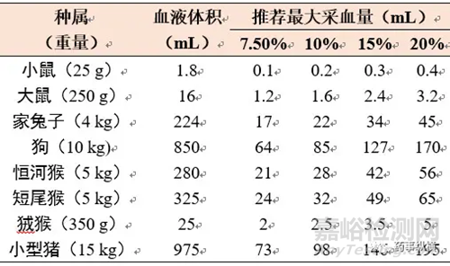 表8 給出體重的各種不同種屬的實驗動物的總血量及推薦的最大采血量