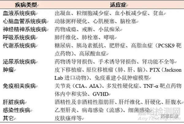 對于基因治療藥物、抗體藥物、細胞因子和蛋白質(zhì)類藥物及化學藥物在體內(nèi)有效性的評價,涉及到的動物主要為正常動物或病理模型動物。其中,選擇模型動物的依據(jù)也是基于受試藥物在臨床上的適應癥,同時實驗模型必須能反映藥理作用的本質(zhì),如果有些新藥確實無法滿足上述動物模型要求,應該充分說明改用其它模型的理由。常見動物模型如表4所示。