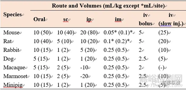 e. 每一欄內(nèi)有兩組數(shù)字,左邊的數(shù)字代表的是指導原則中適用于單次或多次給藥時的給藥體積。右邊括號內(nèi)的數(shù)字代表的是可能的最大給藥體積。如果超過這個給藥體積那么將會導致動物權益與實驗的科學性之間產(chǎn)生矛盾。在某些情況下,給藥體積要與藥典的要求相適應。