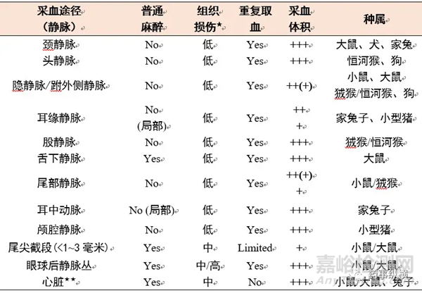 在毒代動力學研究中,大鼠采血可采用:尾靜脈、趾脈管系、全麻下心臟穿刺、全麻下頸外靜脈和頸總動脈插管。兔和豚鼠可用耳緣靜脈、頸靜脈或隱靜脈。較大動物的采血可從淺表靜脈進行(隱靜脈、頭靜脈、頸靜脈)。EFPIA和ECVAM聯(lián)合發(fā)布的指導原則中列出了關于動物推薦采血部位,如表9所示。