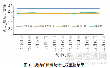 對于第一次投入使用的測量設備類型,由于設備特性未知,初始的校準周期可參考設備檢定規(guī)程、校準規(guī)范,以及測量設備制造商建議的周期。在測量設備使用過程中,可根據(jù)校準結果的分布趨勢、期間核查的結果,以及使用過程中測量設備的狀態(tài)重新調(diào)整測量設備校準周期,以確保測量設備處于合理的測量狀態(tài),保證測量結果的有效性和可靠性。常用的方法為控制圖法,通過監(jiān)控多次校準結果、期間核查結果的趨勢,延長或縮短校準周期。如果控制圖顯示多次校準結果都在控制限內(nèi),且沒有明顯趨勢變化,可以認為當前的校準周期合適,可以繼續(xù)使用。然而,如果控制圖顯示多次校準結果有超出控制限的趨勢,或者有明顯的趨勢變化,就需要考慮調(diào)整校準周期。如果趨勢表明校準結果越來越差,可能需要縮短校準周期,以便及時發(fā)現(xiàn)問題并進行糾正。相反,如果趨勢表明校準結果越來越好,可以延長校準周期,以減少不必要的校準工作。校準周期的調(diào)整可參考JJF 1139—2005《計量器具檢定周期確定原則和方法》以及CNAS-TRL-004:2017《測量設備校準周期確定和調(diào)整方法指南》。圖1為燒結礦標樣統(tǒng)計過程監(jiān)控結果。