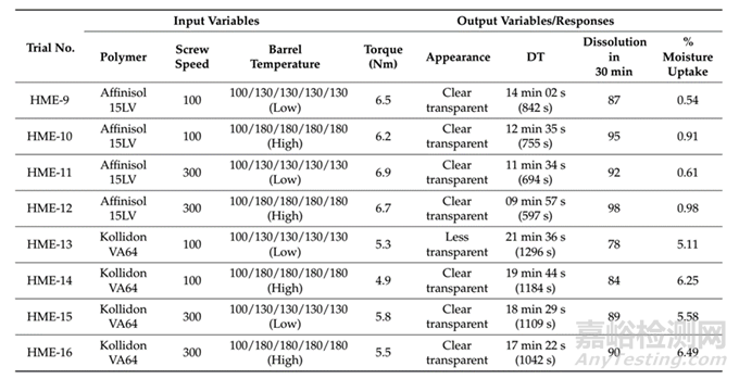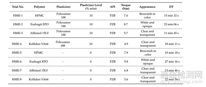 實(shí)驗(yàn)設(shè)計(jì)1是為了研究配方成分對擠出物質(zhì)量的影響,設(shè)計(jì)了考察了不同聚合物類型(VA64、HPMC、Eudragit EPO、Affinisol 15LV)和增塑劑水平對產(chǎn)物外觀、扭矩和崩解時(shí)限的影響,目的是選擇合適的聚合物,使其與藥物的混溶性更好,并制備易于HME處理和藥物含量損失最小的固體分散體。結(jié)果如表4所示。