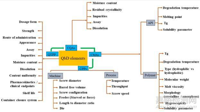 以HME制備ASD為例,QbD中的要素主要由圖2所示。下面將對HME中的QTPP、CQA、CMA、CPP以及對應(yīng)的風(fēng)險(xiǎn)評估與實(shí)驗(yàn)設(shè)計(jì)進(jìn)行介紹