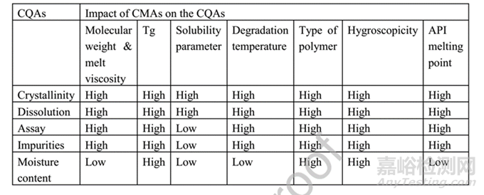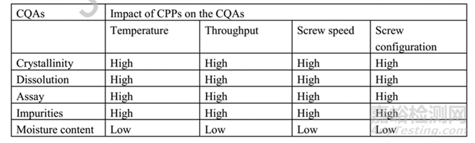 CMA是對CQA有直接影響的原料藥和輔料的性質(zhì),被認(rèn)為是產(chǎn)品質(zhì)量監(jiān)管的基本要素。使用HME開發(fā)ASD的CMA包括API和聚合物材料的流變特性、玻璃轉(zhuǎn)化溫度Tg、降解溫度Td、粒度、粉末流動(dòng)性。聚合物類型(速釋vs緩釋和pH依賴性或pH非依賴性)和性質(zhì)(無定形、結(jié)晶或半結(jié)晶)也同樣重要。這些參數(shù)的研究和表征為識別HME的CPP提供了信息。