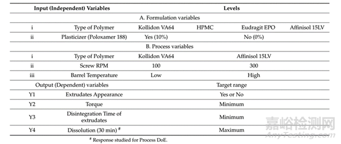 Amit Gupta等人借助定制篩分設(shè)計(jì)軟件對鹽酸帕唑帕尼擠出物進(jìn)行了開發(fā),作者設(shè)計(jì)了兩組實(shí)驗(yàn),第一組實(shí)驗(yàn)以扭矩值、外觀和崩解時(shí)限作為響應(yīng),研究聚合物類型和增塑劑水平對擠出物可加工性質(zhì)量的影響;第二組實(shí)驗(yàn)測定了工藝參數(shù)(如螺桿轉(zhuǎn)速和料桶溫度)對擠出外觀、扭矩、崩解時(shí)限和溶出曲線的影響。實(shí)驗(yàn)設(shè)計(jì)如表3所示,實(shí)驗(yàn)設(shè)計(jì)1包括兩個(gè)輸入變量,一個(gè)分類(聚合物類型)和一個(gè)連續(xù)(增塑劑水平)因素;實(shí)驗(yàn)設(shè)計(jì)2包括三個(gè)因素-一個(gè)分類因素(聚合物類型)和兩個(gè)連續(xù)因素(螺桿轉(zhuǎn)速和料桶溫度);兩個(gè)實(shí)驗(yàn)的響應(yīng)(因變量)變量為擠出物外觀、機(jī)器扭矩和崩解時(shí)限和溶出度。