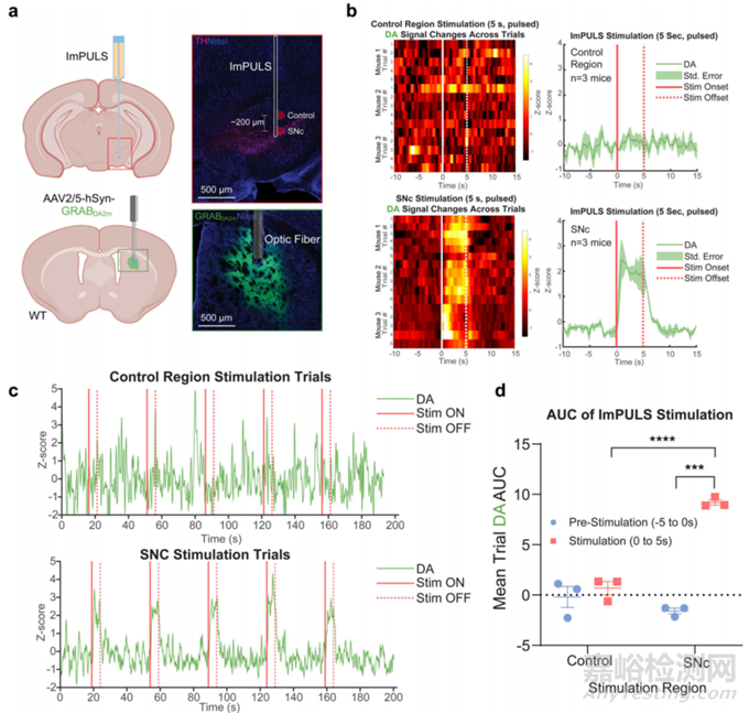 為了測(cè)試ImPULS刺激對(duì)體內(nèi)神經(jīng)傳遞功能調(diào)節(jié)的效用,該研究嘗試通過(guò)對(duì)黑質(zhì)紋狀體(SNc)進(jìn)行 ImPULS 刺激來(lái)調(diào)節(jié)黑質(zhì)紋狀體多巴胺(DA)釋放。結(jié)果表明,與刺激前基線(xiàn)相比,SNc刺激期間的DA AUC顯著增加,此外,SNc刺激期間的DA AUC顯著高于對(duì)照組刺激,而SNc和對(duì)照組刺激期間的基線(xiàn)AUC沒(méi)有顯著差異。綜上所述,ImPULS以空間局部的方式引發(fā)黑質(zhì)紋狀體DA釋放。在4只小鼠中,在相同參數(shù)下,mPULS介導(dǎo)的SNc刺激1.5s后,DA2m熒光平均分?jǐn)?shù)增加,表明較短時(shí)間的刺激足以誘導(dǎo)DA釋放。這些數(shù)據(jù)表明,空間定位的腦深部超聲刺激能夠調(diào)節(jié)體內(nèi)的神經(jīng)傳遞,甚至可以通過(guò)長(zhǎng)距離投射。