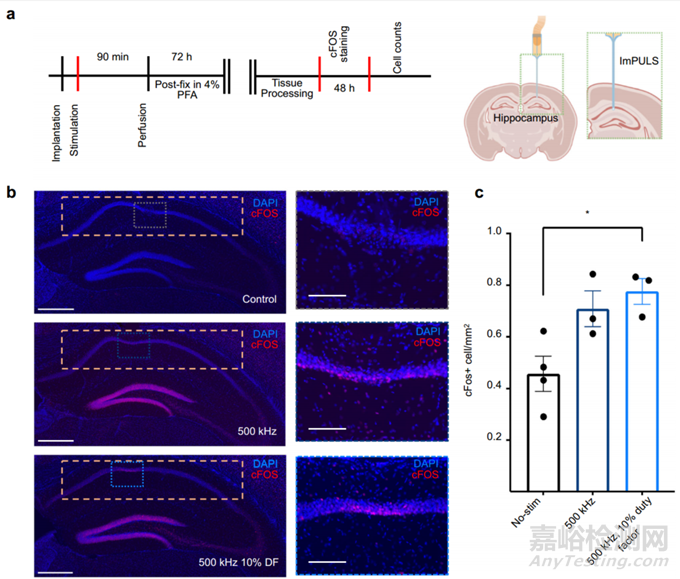 為了測(cè)試ImPULS在小鼠體內(nèi)激活細(xì)胞群的效力,ImPULS被植入定位到小鼠的海馬結(jié)構(gòu)的背側(cè)CA1 (dCA1) 層,并量化dCA1中cFos的相對(duì)水平。與無(wú)刺激(對(duì)照)組相比,所有刺激參數(shù)的結(jié)果中活動(dòng)依賴(lài)性基因 cFos 的平均水平有所增加,這表明ImPULS足以激活小鼠海馬 dCA1 層中的大量細(xì)胞。除此之外,結(jié)果還表明ImPULS刺激足以在慢性植入后引發(fā)神經(jīng)元激活,說(shuō)明ImPULS設(shè)備在更長(zhǎng)期的時(shí)間尺度上具有功能可行性。