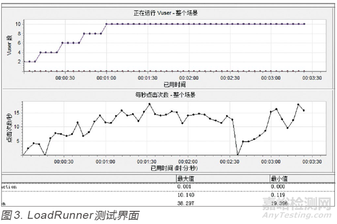 性能測試主要采用并發(fā)測試、負載測試、穩(wěn)定性測試等方法,來考察被測軟件的響應(yīng)時間、并發(fā)數(shù)、資源利用率和穩(wěn)定性等性能。測試過程通常需要專業(yè)工具來輔助完成,比如惠普公司推出的LoadRunner 就是一款常用的性能測試工具。它主要包括三個組件:虛擬用戶生成器(Vuser Generator)、控制器(Controller)和分析器 (Analysis)[10]。通過虛擬用戶生成器可以錄制、調(diào)試Vuser 腳本,利用控制器可以進行模擬場景的設(shè)計和執(zhí)行,最后借助分析器收集、存儲和分析測試數(shù)據(jù),并以圖形和表格的形式展示測試結(jié)果,如用戶數(shù)、每秒點擊次數(shù)、吞吐量、事務(wù)平均用時等,LoadRunner 測試界面如圖3所示,實現(xiàn)對被測軟件和服務(wù)器的自動化測試。