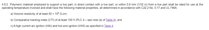 另外,用于直接支撐帶電部件,與帶電部件接觸,或在帶電部件周圍0.8mm范圍內(nèi)的塑料材料,需要滿足以下3點(diǎn)要求: