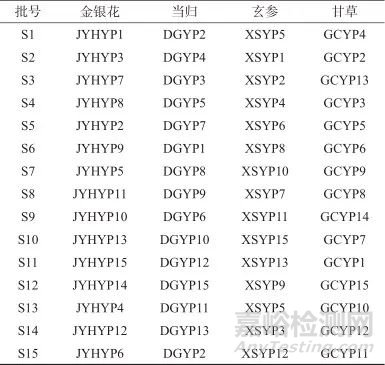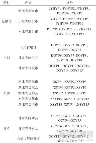 金銀花、當(dāng)歸、玄參、甘草藥材樣品:產(chǎn)地及批號(hào)見表1,通過隨機(jī)數(shù)表法對(duì)表1中不同品種及批次藥材進(jìn)行隨機(jī)組合,見表2,北京園禾方圓植物科技股份有限公司。