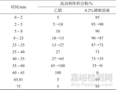 色譜柱:ZORBAX SB-C18柱(250 mm×4.6 mm,5 μm,美國(guó)安捷倫科技有限公司);柱溫:25 ℃;檢測(cè)波長(zhǎng):210 nm;流動(dòng)相:A相為乙腈,B相為0.2%(體積分?jǐn)?shù),下同)磷酸溶液,流量為0.8 mL/min,梯度洗脫,洗脫程序見表3;進(jìn)樣體積:10 μL,理論板數(shù)按綠原酸峰計(jì)應(yīng)不低于5 000。