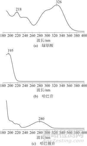 圖1 綠原酸、哈巴苷及哈巴俄苷對(duì)照品的紫外吸收光譜