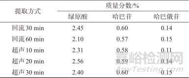 表4 不同提取方式及不同提取時(shí)間下綠原酸、哈巴苷、哈巴俄苷質(zhì)量分?jǐn)?shù)測(cè)定結(jié)果