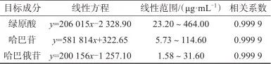表7 三種指標(biāo)成分的線性方程與線性范圍