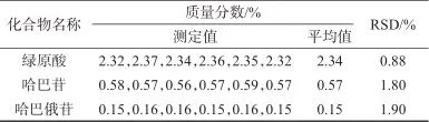 精密稱取S1樣品,按1.3方法平行制備6份樣品溶液,按1.2色譜條件進(jìn)樣測(cè)定,結(jié)果見表8。由表8可見,綠原酸、哈巴苷及哈巴俄苷含量測(cè)定結(jié)果的相對(duì)標(biāo)準(zhǔn)偏差分別為0.88%、1.80%、1.90%,表明該方法的精密度良好。